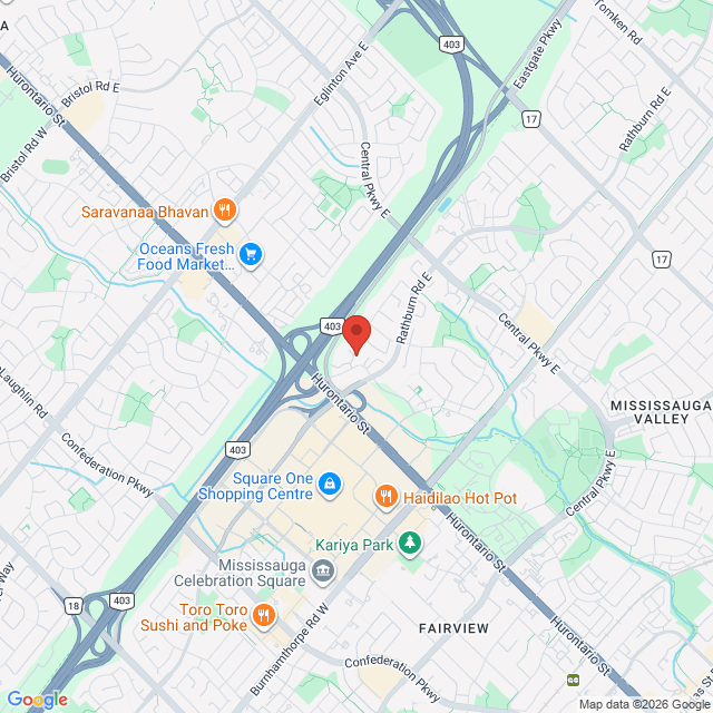 Located in the Village Centre near Square One. Major intersection is Rathburn and Sherwood Dr.